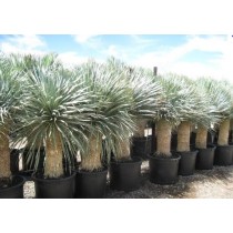 D'une une hauteur de 4m, avec un tronc assez épais, recouvert par les anciennes feuilles séchées, ses feuilles bleues métalliques sont mesurent entre 40 et 60 cm.